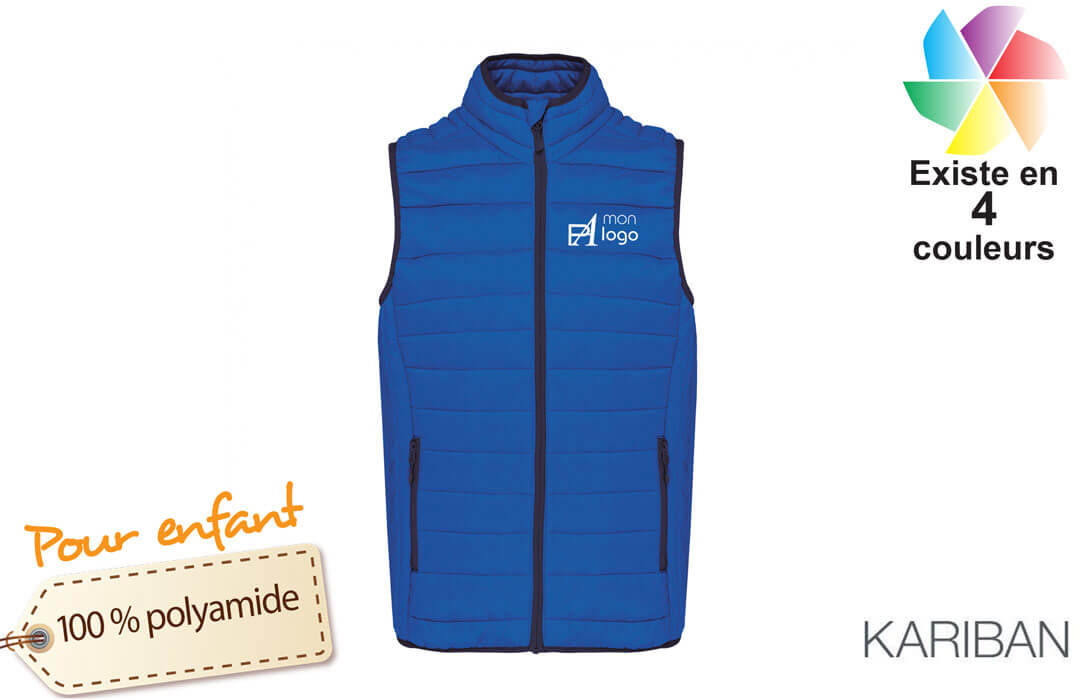 La doudoune sans manche enfant Kariban personnalisée est un vêtement promotionnel fonctionnel et résistant, parfait pour allier confort et communication visuelle. Commandez dès maintenant votre doudoune sans manche enfant Kariban personnalisée à petit prix sur Goodies Discount.
