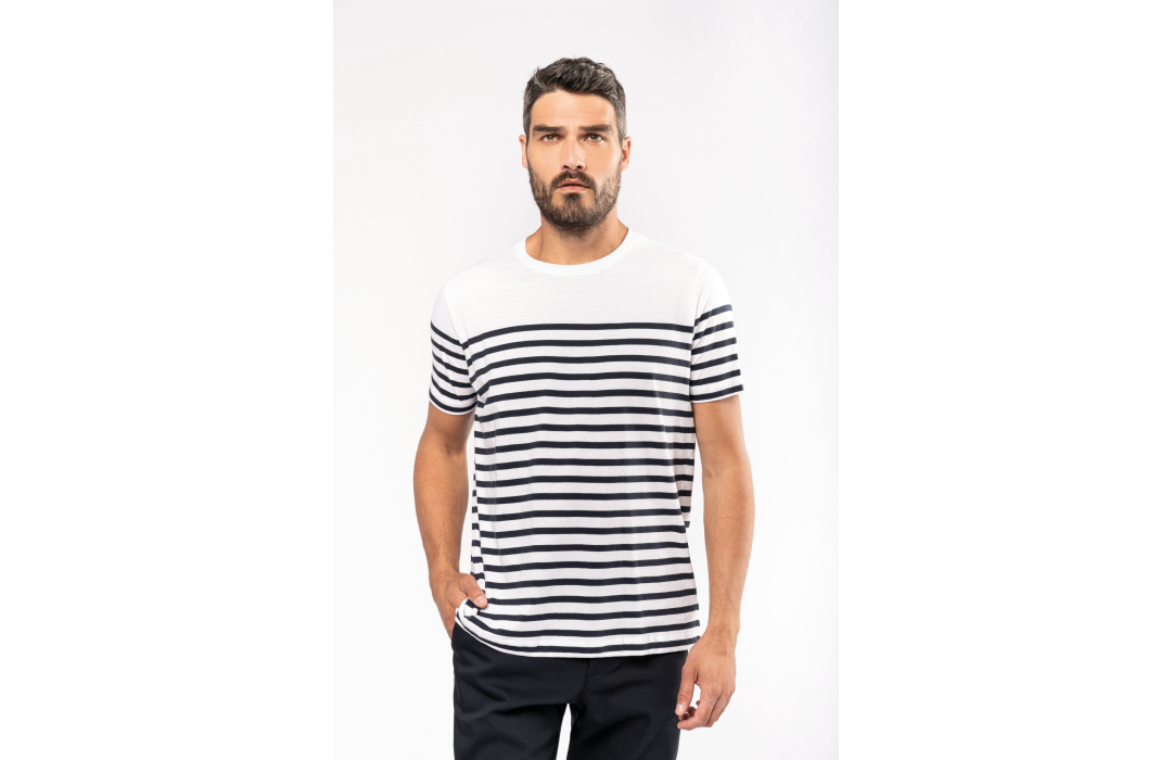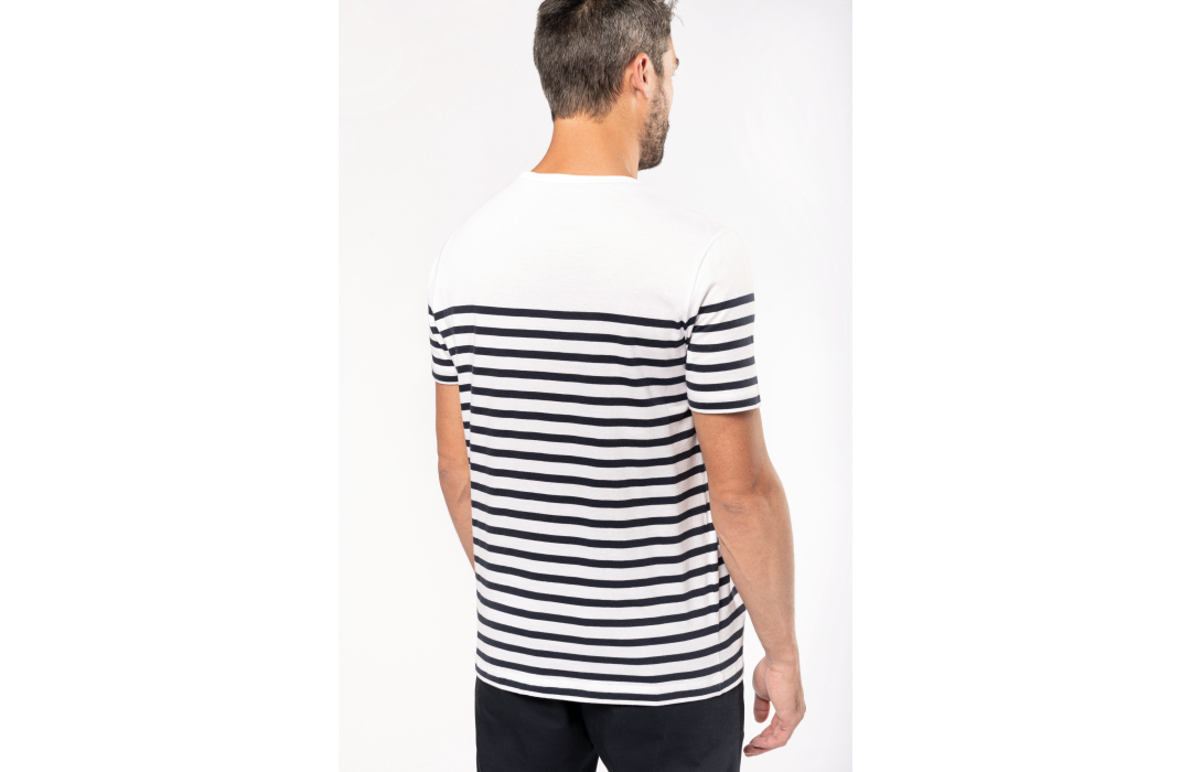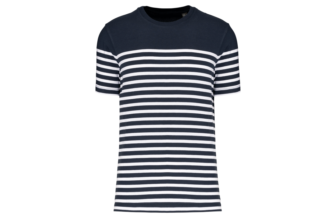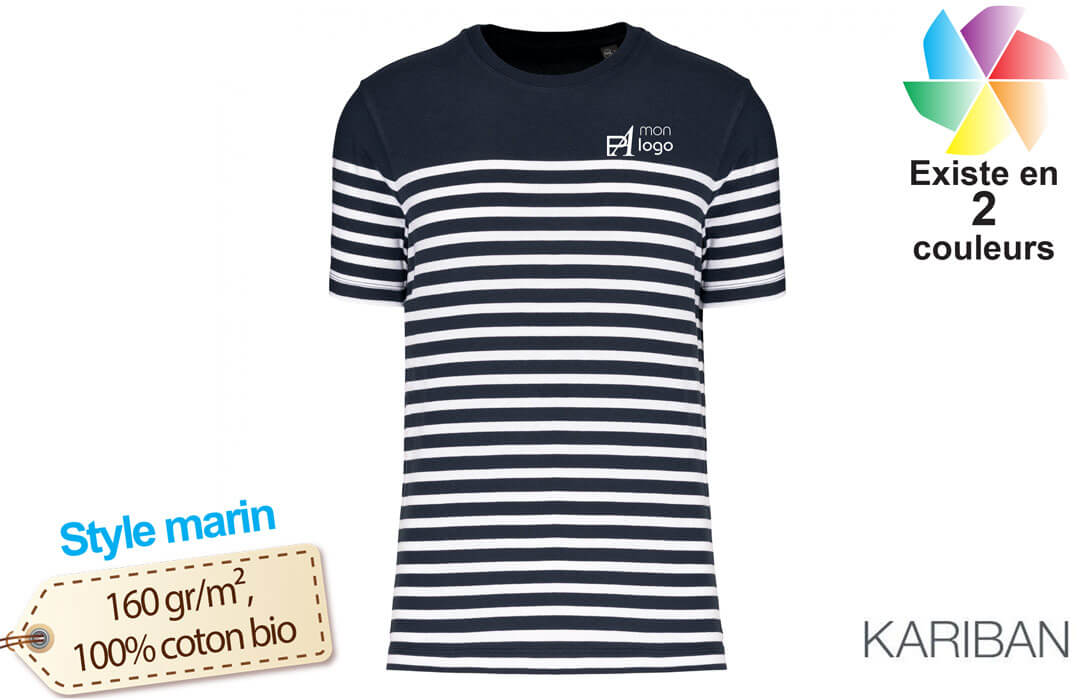 Le t-shirt marinière homme en coton bio personnalisé est un vêtement publicitaire durable et élégant, idéal pour habiller vos équipes ou promouvoir votre marque avec style. Confectionné en coton peigné lavé aux enzymes, il assure un toucher doux, une excellente tenue dans le temps et une parfaite imprimabilité pour vos marquages professionnels. Ce t-shirt à rayures, inspiré du vestiaire marin, conjugue confort, image premium et engagement écoresponsable, un atout de choix pour vos opérations de communication textile.